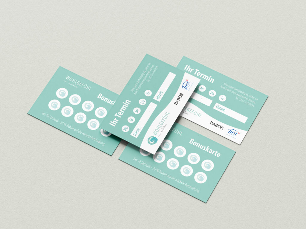 Für Wohlgefühl Oberhardt wurde ein stimmiges und einladendes Erscheinungsbild entwickelt – inklusive Logo, Printmedien, Schildern, Termin- und Bonuskärtchen sowie ausgewählten Werbeartikeln. Sanft, klar und ganz im Zeichen des Wohlfühlens gestaltet.